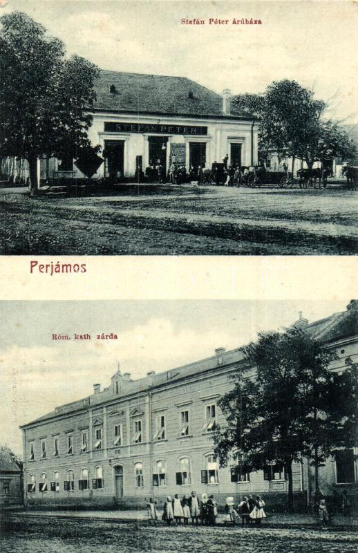 Perjámos, Periam; Római katolikus zárda, Stefán Péter áruháza és saját... https://www.darabanth.com/de/288-Fernauktion/288.0/Ansichtskarten/Siebenburgen~200006/Perjamos-Periam-Romai-katolikus-zarda-Stefan-Peter-aruhaza-es-sajat-kiadasa-W-L-Bp-~II1515905