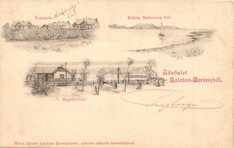 Beschreibung: Balatonberény, nyaralók, Megállóhely, vasútállomás, Badacsony. Mérei Ignácz kiadása (Rb)