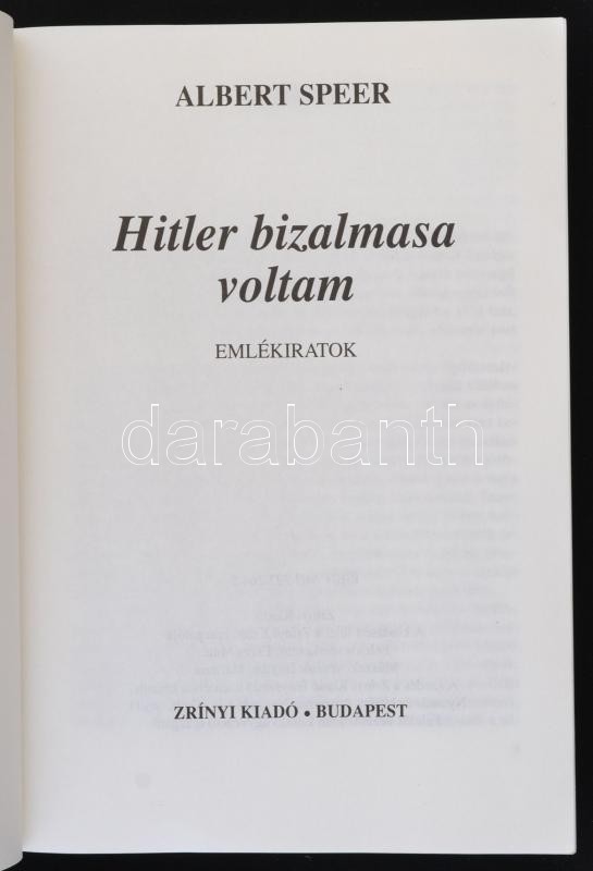 Albert Speer: Hitler bizalmasa voltam. Bp., 1996, Zrínyi Kiadó. Kiadói... https://www.darabanth.com/de/288-Fernauktion/288.0/Bucher/Bucher-Geschichte~31/Albert-Speer-Hitler-bizalmasa-voltam-Bp-1996-Zrinyi-Kiado-Kiadoi-papirkotesben~II1514099