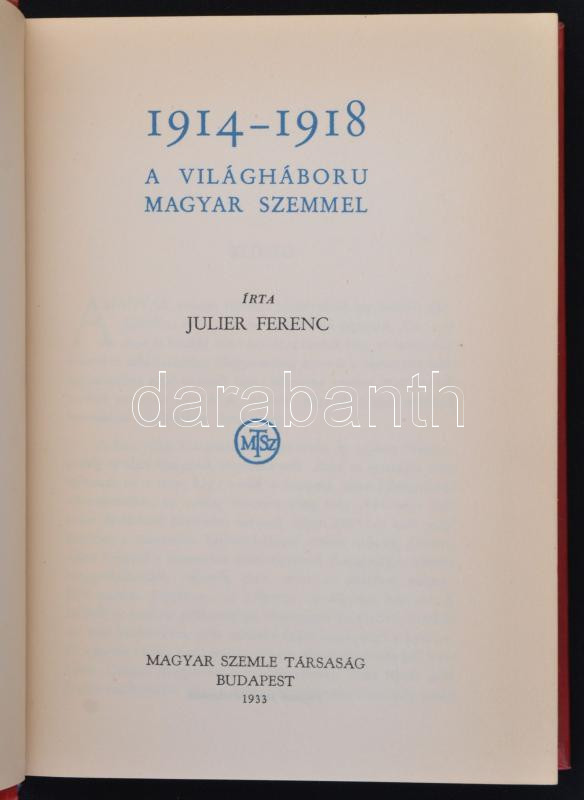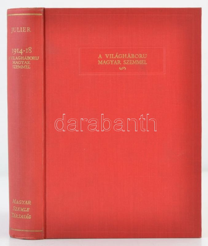 Julier Ferenc: 1914-18 A világháboru magyar szemmel. Magyar Szemle Társaság Könyvei VII. Budapest, 1933, Magyar Szemle Társaság. Foltos félvászon kötés, 15 térképmelléklettel, 3 kihajtható levélen, illusztrálva. Jó állapotban.