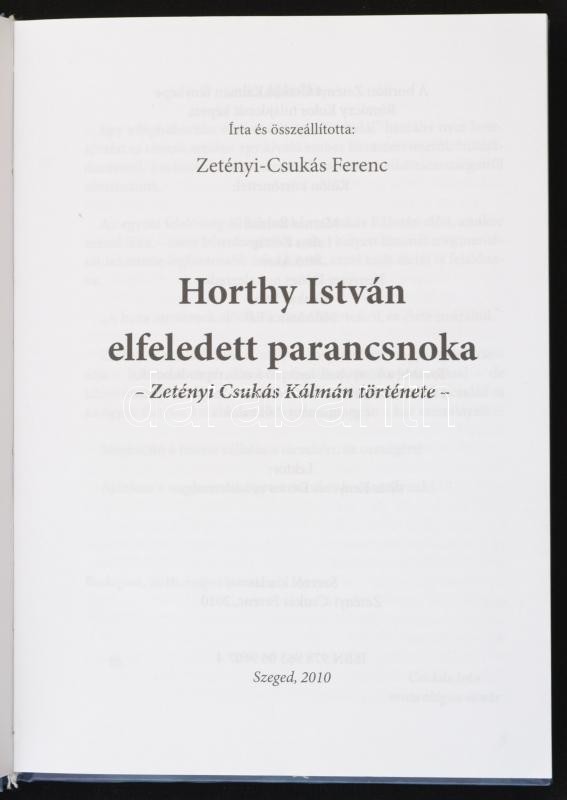 Zetényi-Csukás Ferenc: Horthy István elfeledett parancsnoka. Zetényi Csukás Kálmán története. Szeged, 2010, Szerzői kiadás. Kiadói kartonált papírkötés. Jó állapotban.
