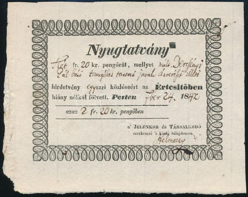 Beschreibung: 1842 A Jelenkor és Társalkodó hirdetési nyugtája