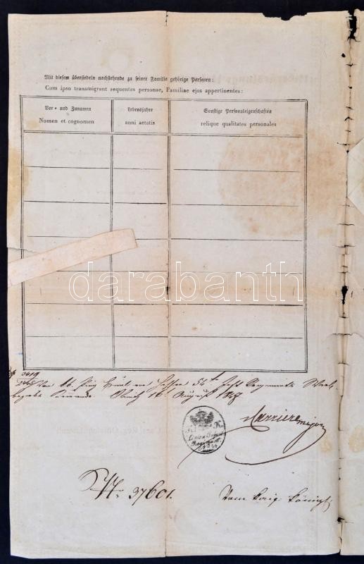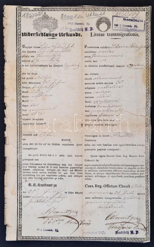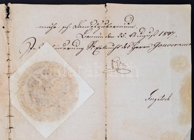 1847 Übersiedlungs Urkunde (áttelepítési okirat) Budára településhez, német és latin nyelven, felzetes viaszpecséttel, viseltes állapotban, kis szakadásokkal, 37x22,5 cm