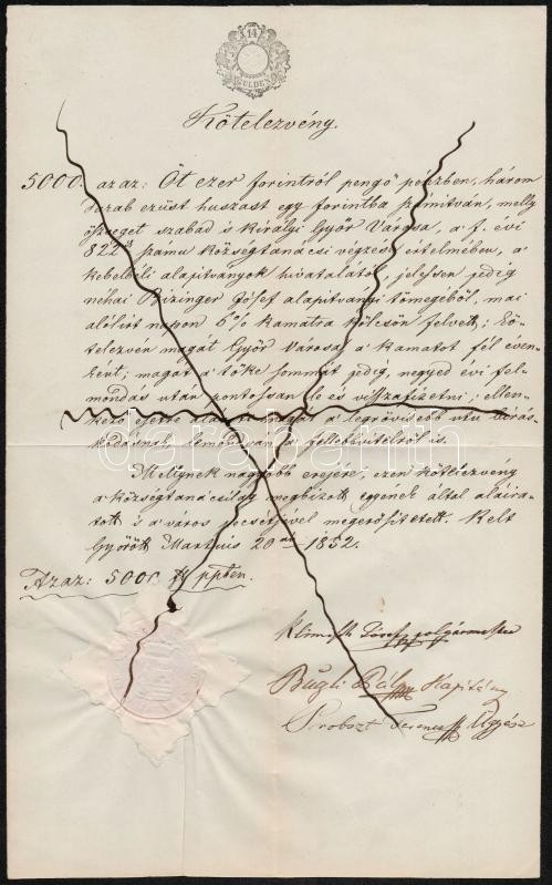 1852 Kötelezvény 14 Gulden! szignettával https://www.darabanth.com/de/289-Fernauktion/289.0/Andere-Sammelgebiete/Dokument~17/1852-Kotelezveny-14-Gulden-szignettaval~II1527193