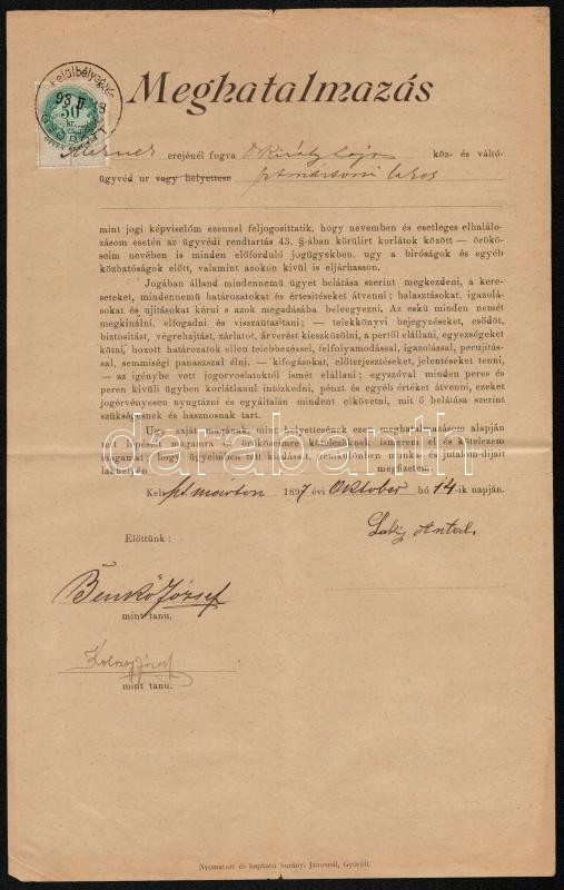 Beschreibung: 1897 Szentmárton, Ügyvédi meghatalmazás 50kr okmánybélyeggel