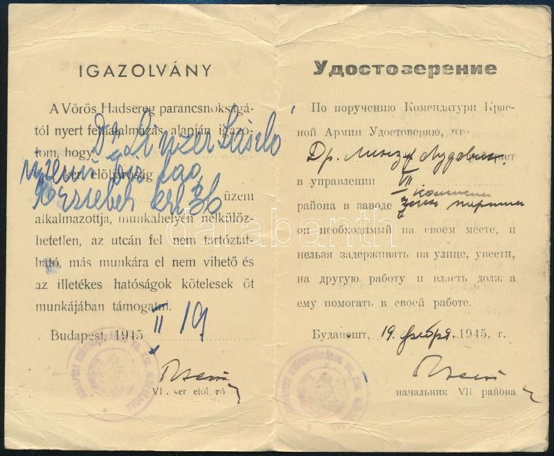 1945 Bp., Orosz és magyar nyelvű szabad kijárást biztosító igazolvány https://www.darabanth.com/de/289-Fernauktion/289.0/Andere-Sammelgebiete/Dokument~17/1945-Bp-Orosz-es-magyar-nyelvu-szabad-kijarast-biztosito-igazolvany~II1521144