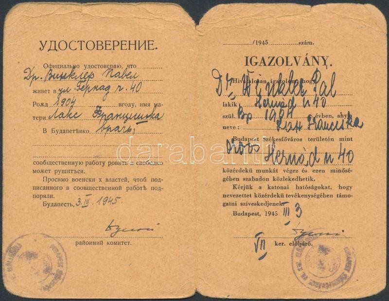 1945 Bp., Szabad közlekedést biztosító magyar és orosz nyelvű igazolvá... https://www.darabanth.com/de/289-Fernauktion/289.0/Andere-Sammelgebiete/Dokument~17/1945-Bp-Szabad-kozlekedest-biztosito-magyar-es-orosz-nyelvu-igazolvany~II1526718