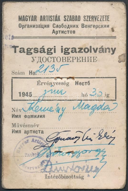 1945 Magyar Artisták Szabad Szervezete, fényképes igazolvány, kissé vi... https://www.darabanth.com/de/289-Fernauktion/289.0/Andere-Sammelgebiete/Dokument~17/1945-Magyar-Artistak-Szabad-Szervezete-fenykepes-igazolvany-kisse-viseltes-allapotban~II1526676
