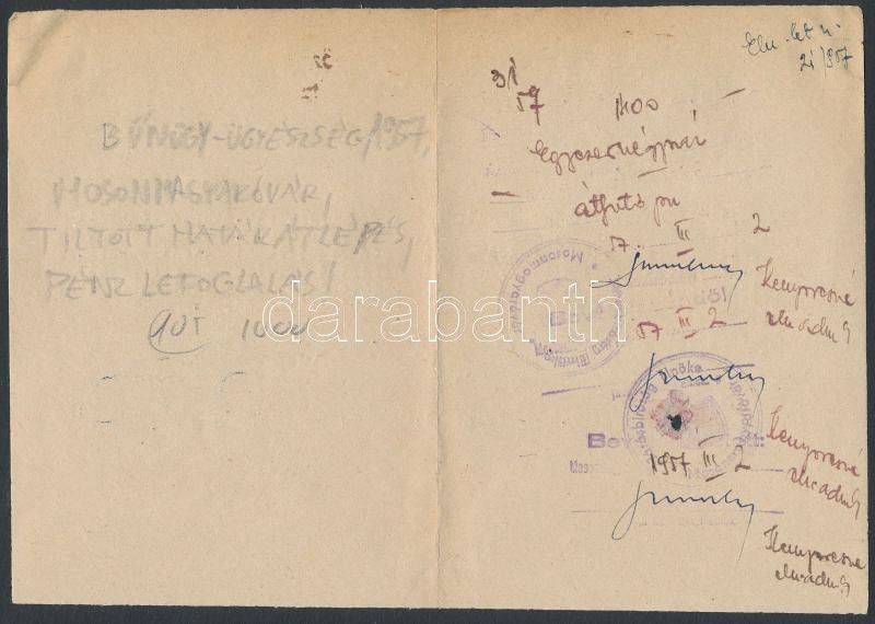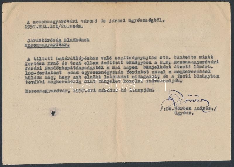 1957 Mosonmagyaróvár, Tiltott határátlépésről szóló bűnügyi okirat https://www.darabanth.com/de/289-Fernauktion/289.0/Andere-Sammelgebiete/Dokument~17/1957-Mosonmagyarovar-Tiltott-hataratlepesrol-szolo-bunugyi-okirat~II1523355