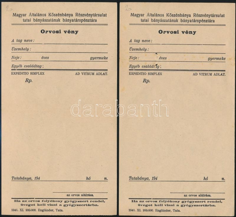 Beschreibung: cca 1940-1950 Tatabánya, A Magyar Általános Kőszénbánya Részvénytársulat tati bányászatának bányatárspénztára kitöltetlen orvosi vény, 2 db