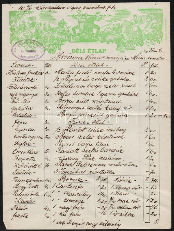 1940 Máriaremete Brunner Sándor vendéglős étlapja https://www.darabanth.com/de/289-Fernauktion/289.0/Andere-Sammelgebiete/Drucksachen~28/1940-Mariaremete-Brunner-Sandor-vendeglos-etlapja~II1521305