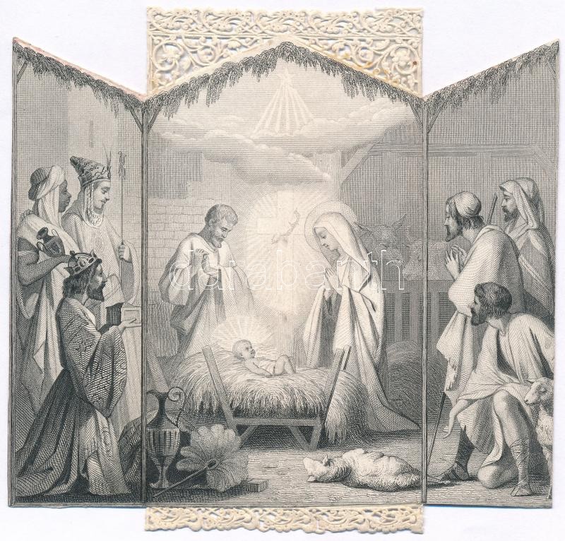cca 1900 Kihajtható csipkés betlehemes szentkép, 11,5x12 cm https://www.darabanth.com/de/289-Fernauktion/289.0/Andere-Sammelgebiete/Drucksachen~28/cca-1900-Kihajthato-csipkes-betlehemes-szentkep-11-5x12-cm~II1524217