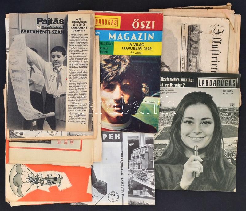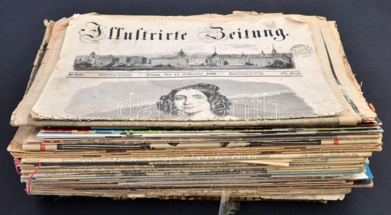 cca 1920-1970 Vegyes átnézendő papírrégiség tétel, többségében újságok, különféle nyomtatványok, műsorfüzetek, benne egy 1847 Illusrirte Zeitung, és Kálnoki Izidor: A Kapitány meséi c. könyv, változó, többségében kissé viseltes állapotban.