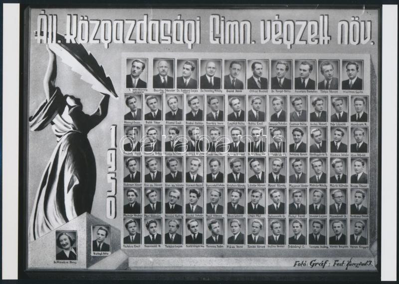 1950 Eger, Áll. Közgazdasági Gimnázium tanári kara és végzett növendékei, kistabló 70 nevesített portréval, a GRÁF műterem vintage üveglemez negatívjáról készült mai nagyítás, 18x25 cm
