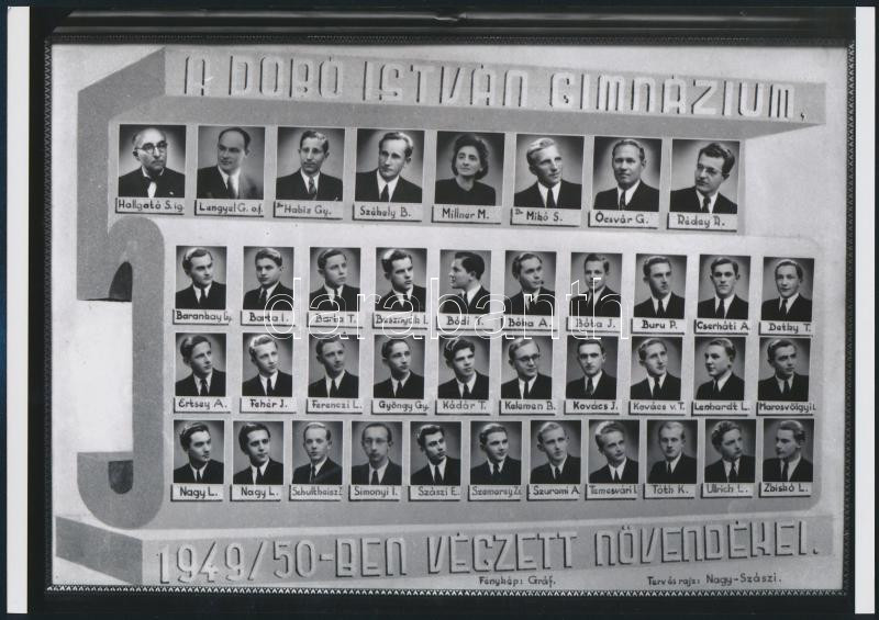 1950 Eger, Dobó István Gimnázium tanári kara és végzett növendékei, kistabló 39 nevesített portréval, a GRÁF műterem vintage üveglemez negatívjáról készült mai nagyítás, 18x25 cm