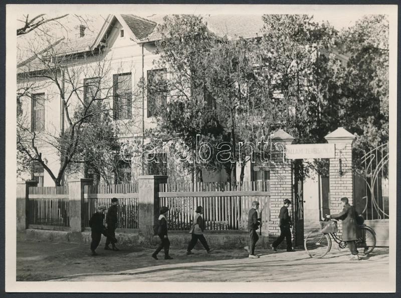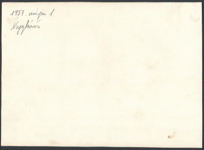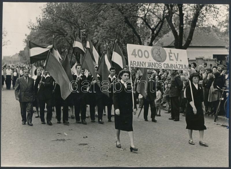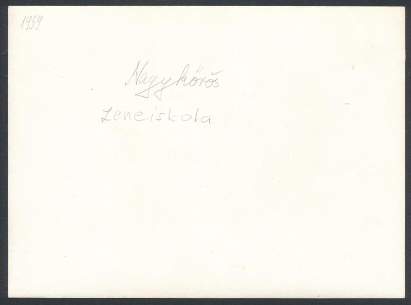 1957-1959 Nagykőrös, zeneiskola, az Arany János Gimnázium 400 éves fennállását ünnepli, 2 db hátoldalon feliratozott fotó, 18x13 és 16x23 cm + Arany János Gimnázium jelvénye