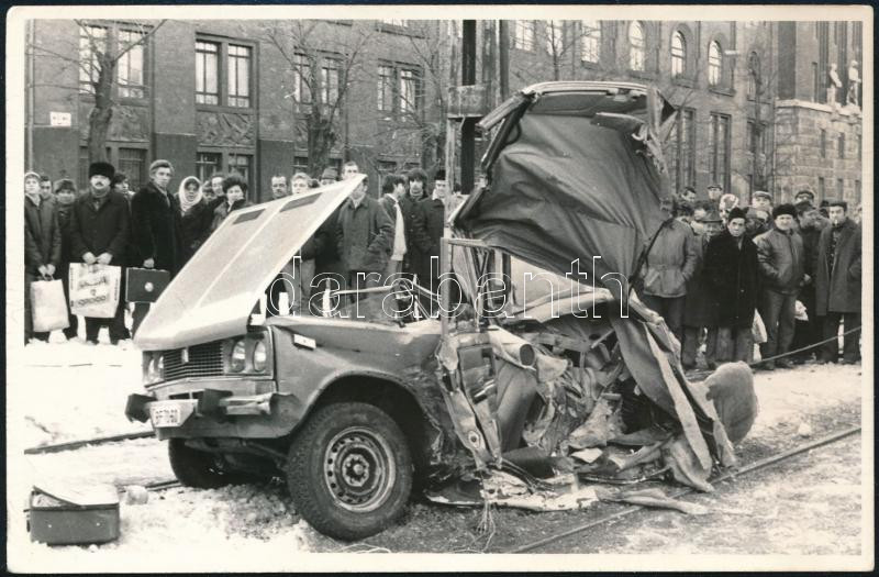 Beschreibung: cca 1980 Budapest, a 23-as villamos balesete során összeroncsolódott autó, fotó, 9×14 cm