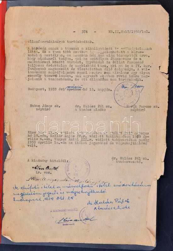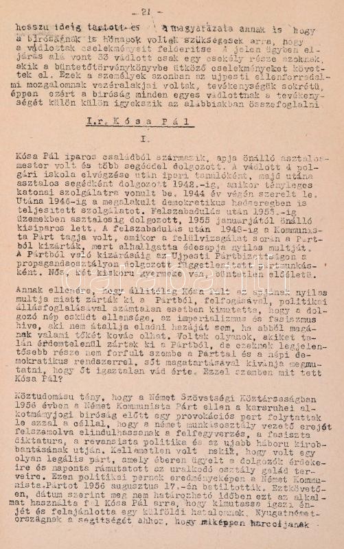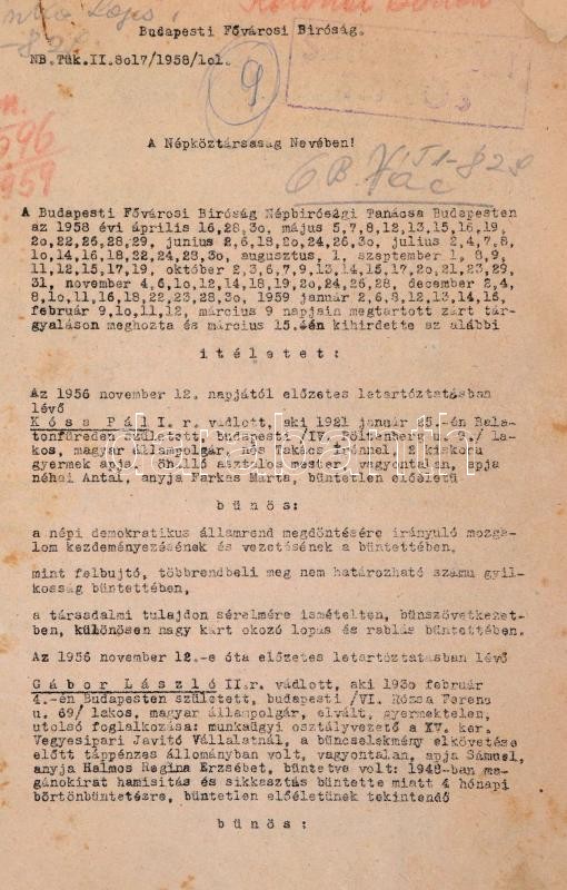1959 Kósa Pál (1921-1959) 1956-os forradalmár és társai perének Legfelsőbb Bíróság és Budapesti Fővárosi Bíróság első- és másodfokú ítéletei. Kósa Pál 1956 október végétől az Újpesti Forradalmi Bizottság vezetője volt. A 33 vádlottat érintő, végül hét kivégzéssel zárult újpesti per az egyik legnagyobb volt a megtorlásokat tekintve. A 404 oldalas dokumentum ismerteti az ítéleteket, részletes indoklást, a vádlottak életrajzát tartalmazza. Korabeli, pecséttel ellátott, hitelesített példány. Rendkívül ritka kordokumentum! Az első oldal szakadozott, egyébként jó állapotban.