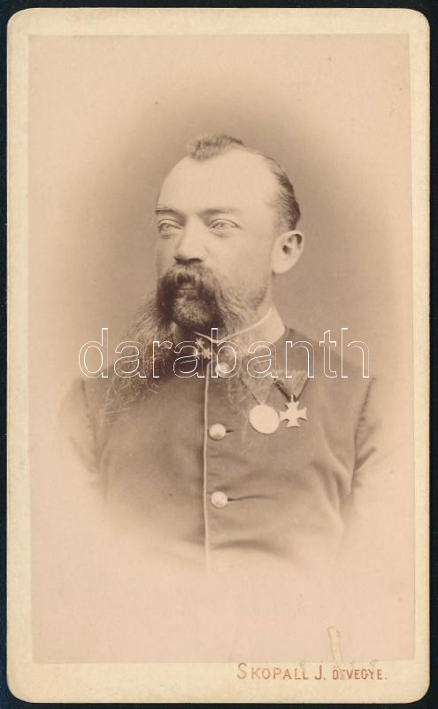 Beschreibung: cca 1900 Osztrák-magyar százados műtermi fotója, kitüntetésekkel, Skopáll J. özvegye Győr műterméből, keményhátú fotó, 9x6 cm