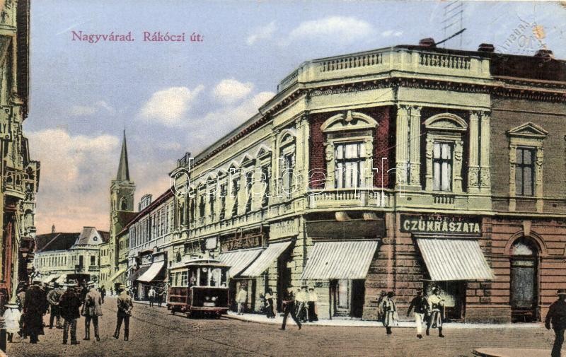 Nagyvárad, Oradea; Rákóczi út, cukrászda, villamos / street, confectio... https://www.darabanth.com/de/289-Fernauktion/289.0/Ansichtskarten/Siebenburgen~400006/Nagyvarad-Oradea-Rakoczi-ut-cukraszda-villamos-street-confectionery-tram-EK~II1527416