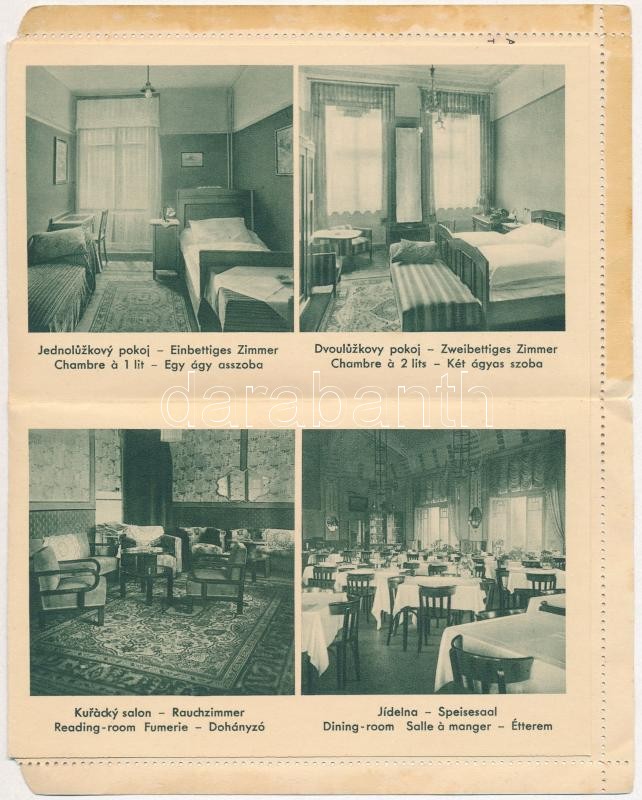Tátra, kinyitható zárt levelezőlap, Hrebeniok sport szálló, a sikló vasút végállomása, szoba belsők, dohányzó, étterem / foldable PS-cover card, sport hotel, funicular railway station, room interiors, smoking room, restaurant