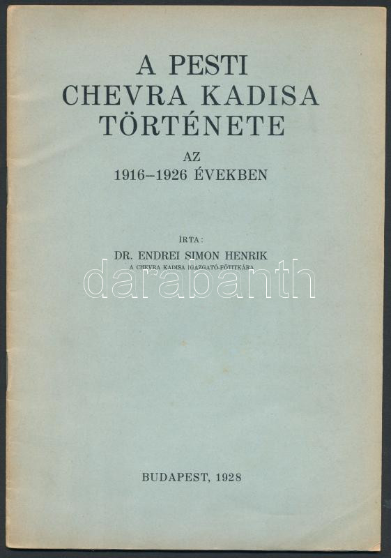 Endrei Simon Henrik: A pesti chevra kadisa története az 1916-1926. éve... https://www.darabanth.com/de/289-Fernauktion/289.0/Bucher/Bucher-Judaica~54/Endrei-Simon-Henrik-A-pesti-chevra-kadisa-tortenete-az-1916-1926-evekben-Bp-1928-Biro-Mikl~II1502373