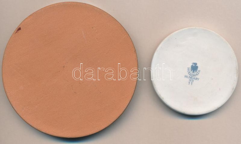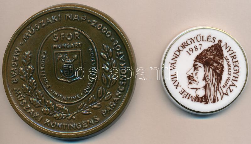 Beschreibung: 1987. "MÉE XVII. Vándorgyűlés Nyíregyháza - Szabolcs vezér" hollóházi porcelán plakett (62mm) + 2000."SFOR Hungary - Magyar Műszaki Kontingens parancsnokától - Műszaki nap" mázzal bevont kerámia plakett (86mm) T:1-
