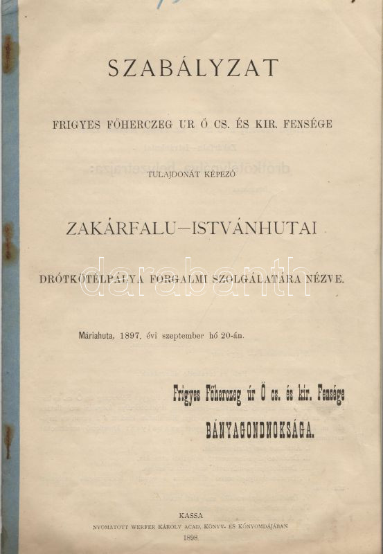 Beschreibung: 1898 Szabályzat a Zákárfalu-istvánhutai drótkötélpálya forgalmi szolgálatára; Werfer Károly nyomdája