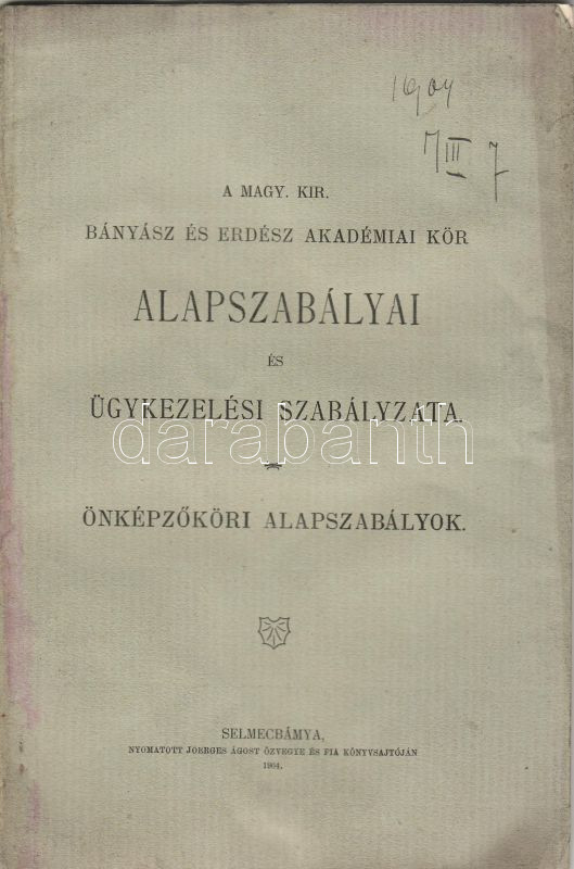1904 A Magy. kir. Bányász és Erdész Akadémiai Kör alapszabályai; Joerg... https://www.darabanth.com/de/29-Fernauktion/29.0/Andere-Sammelgebiete/~256/1904-A-Magy-kir-Banyasz-es-Erdesz-Akademiai-Kor-alapszabalyai-Joerges-Agost-ozvegye-es-~II53263