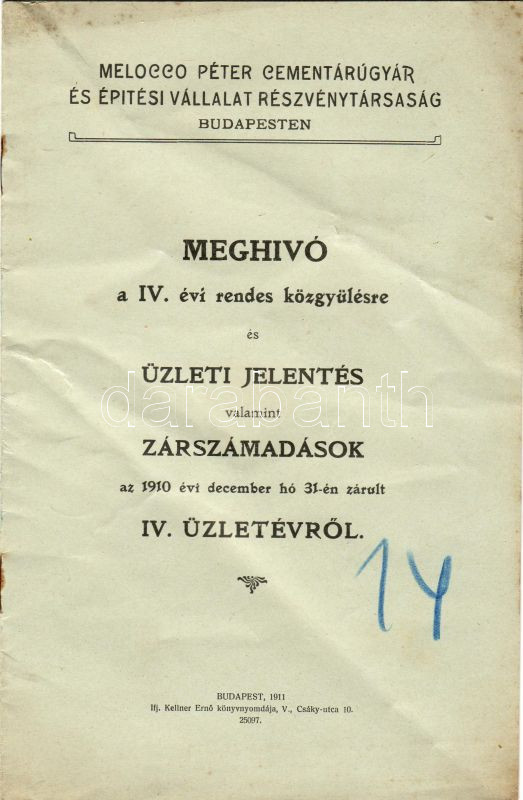 1911 Meghívó a Melocco Péter cementárúgyár és építési vállalat Rt. köz... https://www.darabanth.com/de/29-Fernauktion/29.0/Andere-Sammelgebiete/~256/1911-Meghivo-a-Melocco-Peter-cementarugyar-es-epitesi-vallalat-Rt-kozgyulesere-Ifj~II37106