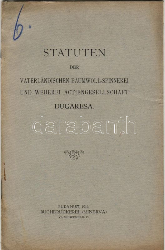 1916 A Dugaresa Hazai gyapjúfonó és szővő egylet alapszabályai német n... https://www.darabanth.com/de/29-Fernauktion/29.0/Andere-Sammelgebiete/~256/1916-A-Dugaresa-Hazai-gyapjufono-es-szovo-egylet-alapszabalyai-nemet-nyelven-Minerva~II37108