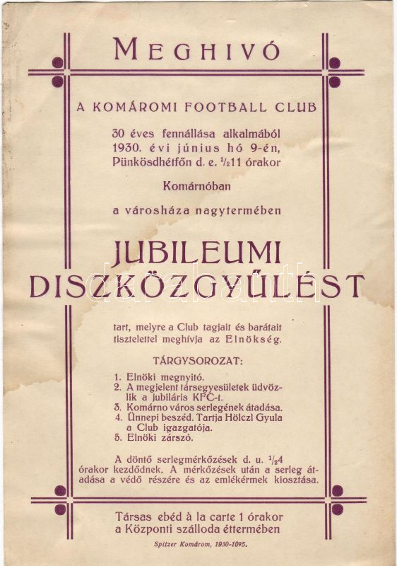 1930 Meghívó a Komáromi Football Club jubileumi díszközgyűlésére https://www.darabanth.com/de/29-Fernauktion/29.0/Andere-Sammelgebiete/~256/1930-Meghivo-a-Komaromi-Football-Club-jubileumi-diszkozgyulesere~II53386
