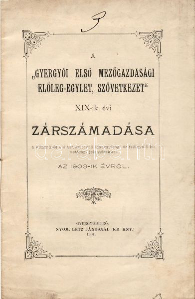 Beschreibung: A Gyergyói Első Mezőgazdasági Előleg-egylet, Szövetkezet zárszámadása 1903; Gyergyóditró 1904 Létz János