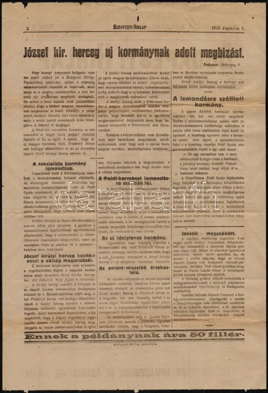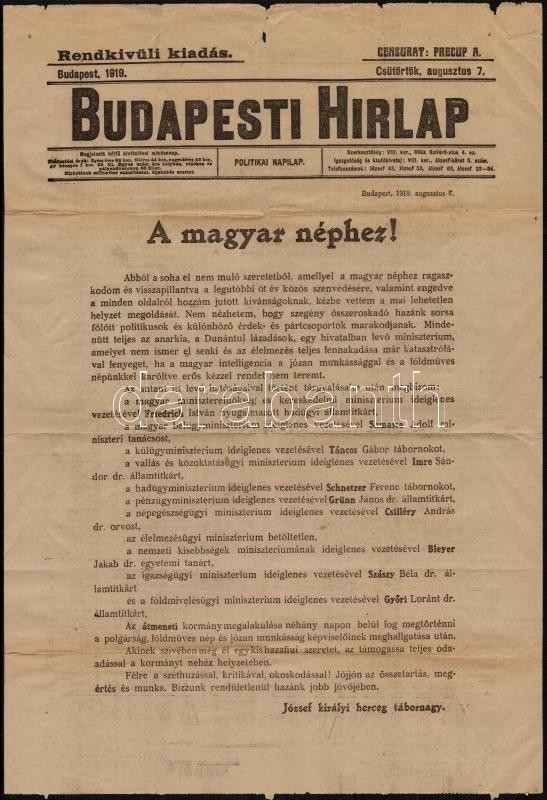 1919 Budapesti Hírlap különszáma József főherceg kinevezi Friedrich Is... https://www.darabanth.com/de/29-Gross-Auktion/29.1/Andere-Sammelgebiete/Drucksachen~11787/1919-Budapesti-Hirlap-kulonszama-Jozsef-foherceg-kinevezi-Friedrich-Istvant-miniszterelnokne~II1764652
