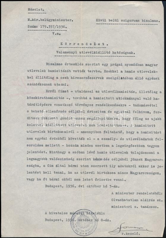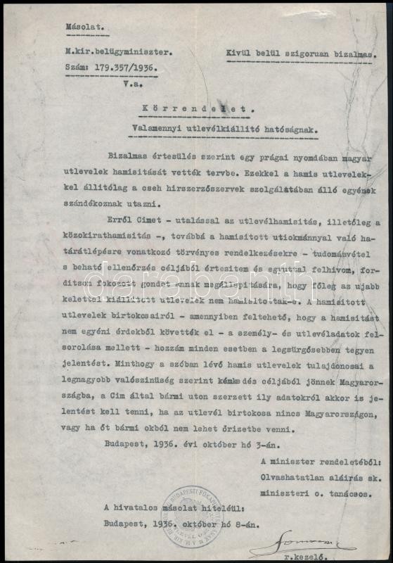 1936 A m. kir. belügyminiszter bizalmas rendelete mely szerint egy prá... https://www.darabanth.com/de/29-Gross-Auktion/29.1/Andere-Sammelgebiete/Drucksachen~11787/1936-A-m-kir-belugyminiszter-bizalmas-rendelete-mely-szerint-egy-pragai-nyomdaban-magyar-utlev~II1773363