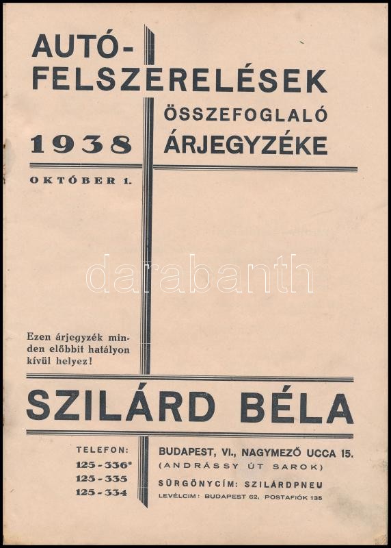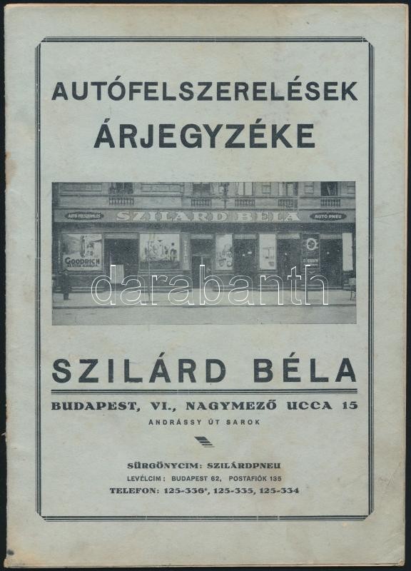 cca 1940 Szilárd Béla autófelszerelések árjegyzéke. 32p. (egy oldalon ... https://www.darabanth.com/de/29-Gross-Auktion/29.1/Andere-Sammelgebiete/Drucksachen~11787/cca-1940-Szilard-Bela-autofelszerelesek-arjegyzeke-32p-egy-oldalon-szakadas~II1765082