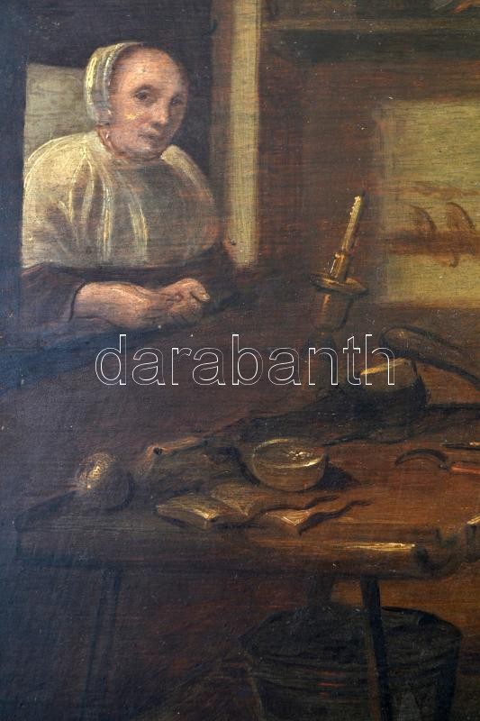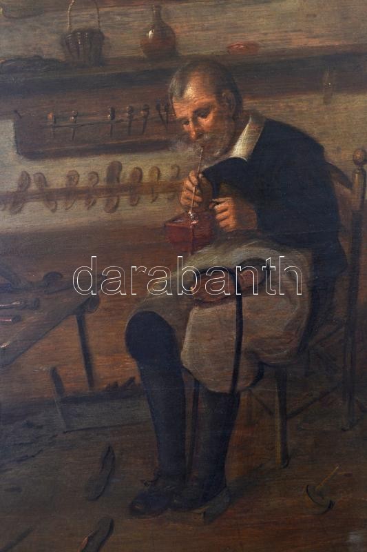 Beschreibung: cca 1800 Jelzés nélkül: Cipészműhely. Olaj, fatábla, kis karcolásokkal, 56×75 cm
