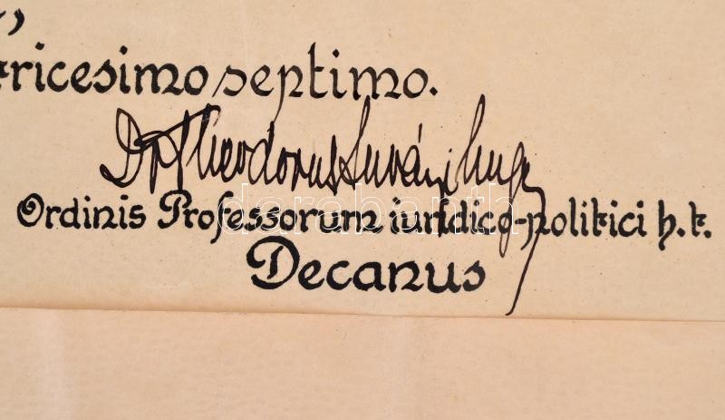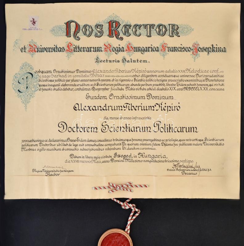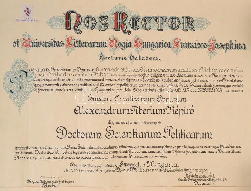 1937 Képíró Sándor (1914-2011) ,az újvidéki razziában való részvétele miatt háborús bűnökkel vádolt, csendőr százados, jogász, a szegedi Ferenc József Egyetem Jogi Karár szerzett diplomája, aláírásokkal, függőpecséttel, 49,5x59,5 cm