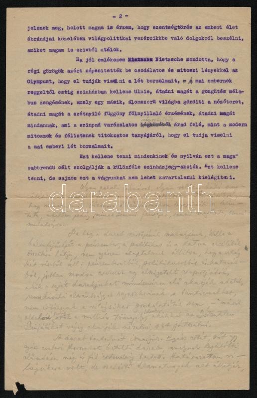 Beschreibung: Zilahy Lajos (1891-1974): Az Istentelen Színjáték. c. kézirata. Félig géppel, félig kézzel írva. Színházi kritika. 3 oldal.