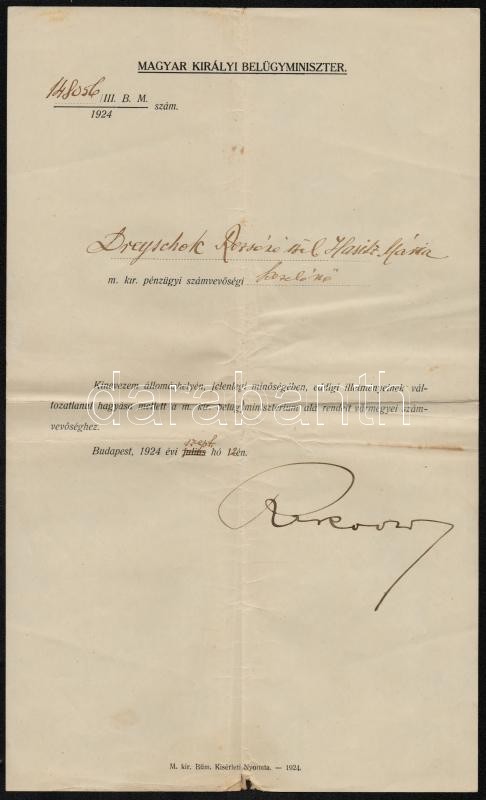 Beschreibung: 1924 Rakovszky Iván belügyminiszter aláírása kinevezésen