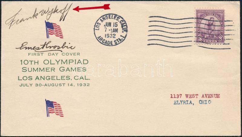 1932 Frank Clifford Wykoff (1909-1980) amerikai atléta saját kézzel aláírt FDC a Los Angelesi Olimpiáról / Olympic champion American athlete's autograph signature from the Los Angeles Olympic Games