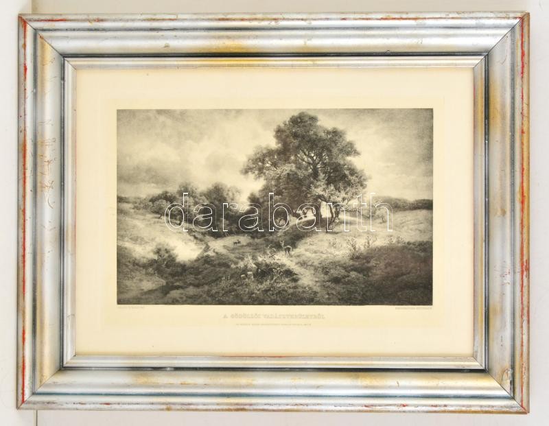 1897 A gödöllői vadászterületről. Keleti Gusztáv képe nyomán készült photogravure. Az Országos Magyar Képzőművészeti Társulat kiadásában, üvegezett keretben, 20×29 cm