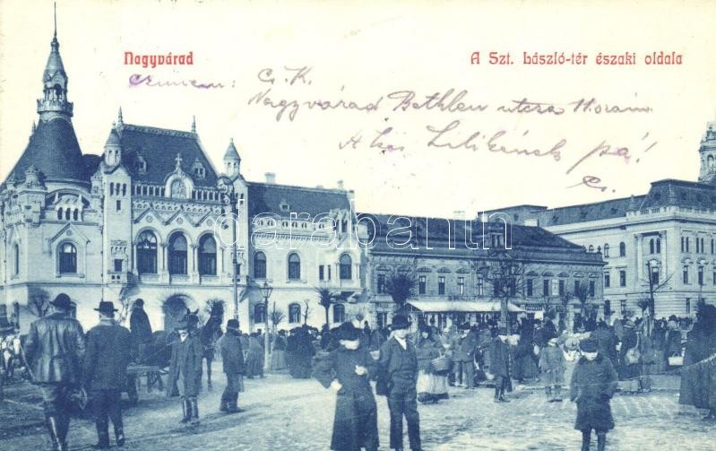 1907 Nagyvárad, Oradea, Grosswardein; Szent László tér északi oldala, piaci forgatag, fodrász, Vigadó Mozgó. Rákos Vilmos kiadása / square, market vendors, hairdresser, shops, cinema