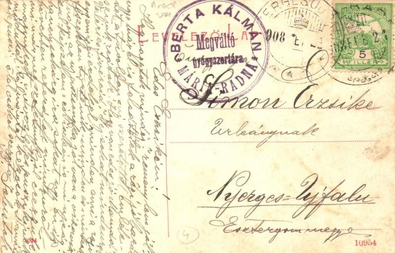 1908 Máriaradna, Radna; Vasút utca, Arad-Hegyaljai motoros vasútállomás, vonat. Berta Kálmán Megváltó gyógyszertárának pecsétje a hátoldalon. 3034. / Bahnhof Gasse / railway street and station with train. Pharmacy's stamp on the backside