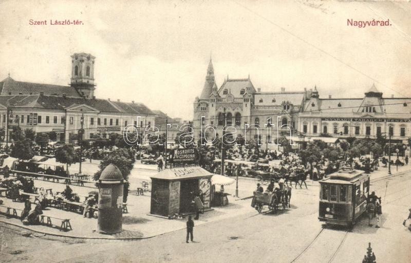 1912 Nagyvárad, Oradea, Grosswardein; Szent László tér, piaci árusok, villamos, Moskovits cipőgyár bódéja, takarékpénztár, zálogház, üzletek. Rigler Rt. kiadása / square, market vendors, tram, shops, savings bank (EK)