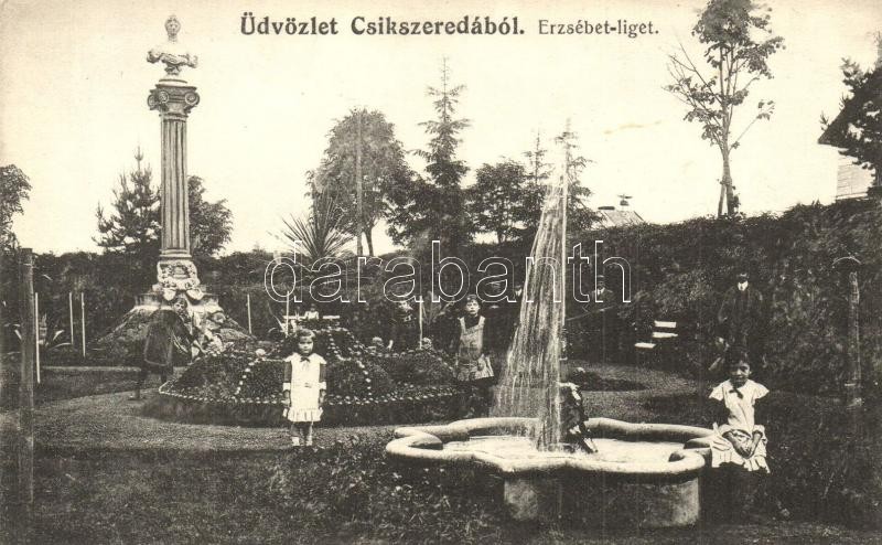 Beschreibung: Csíkszereda, Miercurea Ciuc; Erzsébet liget és szobor, szökőkút. Vákár L. kiadása / park, statue and fountain