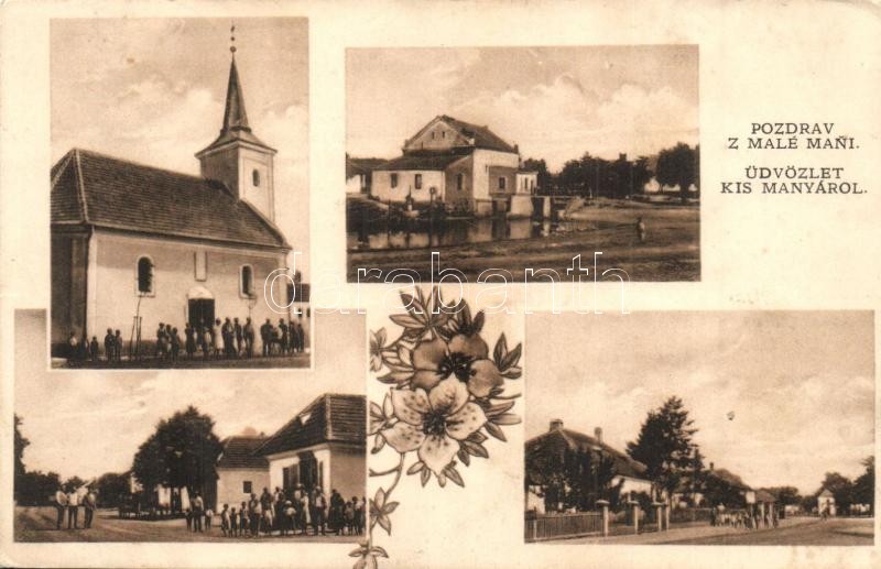 Beschreibung: Kismánya, Malá Mana (Mánya); templom, utcaképek, üzlet / church, streets, shop (EK)