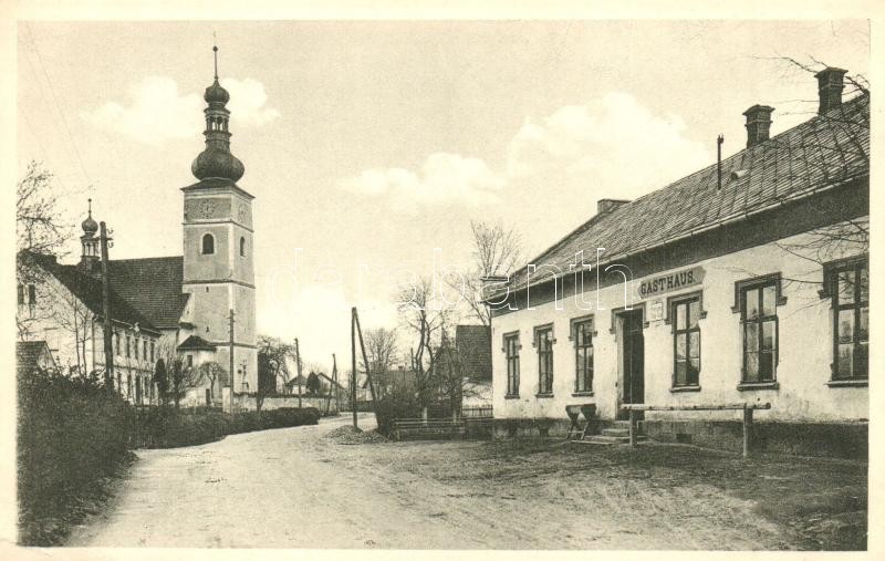 Beschreibung: Senov u Nového Jicína, Schönau bei Neutitschein; Gasthaus / street view with church and guest house hotel