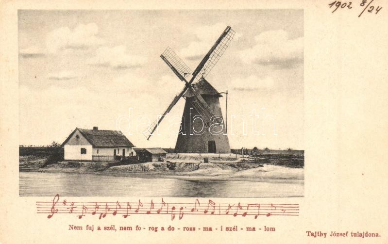 Beschreibung: Kiskundorozsma, szélmalom, kottás lap. Tajthy József kiadása