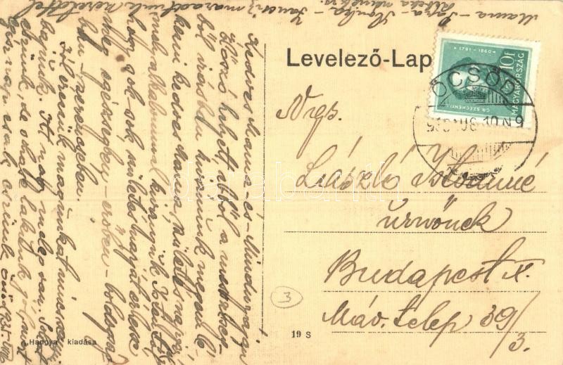 Beschreibung: Öcsöd, Hősök szobra, Református templom, Hangya fogy. szövetkezet üzlete és saját kiadása (EK)